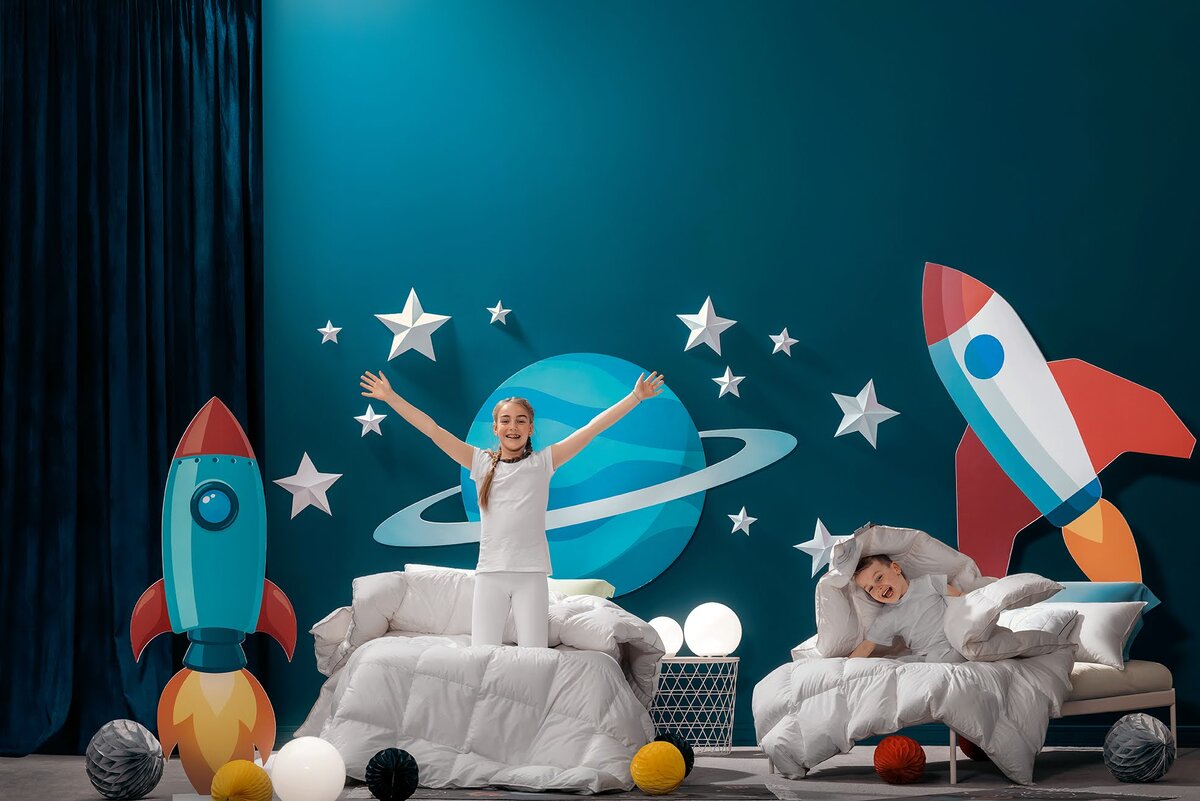Кто в детстве не любил наблюдать ночью за звездами, когда они так хорошо видны, что от их количества кружится голова? И это совсем не удивительно, ведь созерцание космоса потрясает. В честь Дня космонавтики рассмотрим варианты оформления детской в космической стилистике. Создать такой интерьер для мальчика, который увлекается историями из «Звёздного пути» или «Звездных войн» – значит, сделать его счастливым. Чаще всего необычный космический дизайн – выбор мальчишек школьного возраста. Кровать в виде инопланетной капсулы или звездолета с неоновой подсветкой, мебель ярких цветов со звездами и планетами понравятся ребенку, но долго такой интерьер не прослужит. Через несколько лет, когда мальчик подрастет, скорее всего придется обновлять обстановку. Cын мечтает о такой комнате, но вы не хотите делать масштабный ремонт? Используйте более простое решение – несколько элементов космического дизайна, замена которых не нанесет ущерба бюджету и не заставит позже потратить месяцы на полное обновле