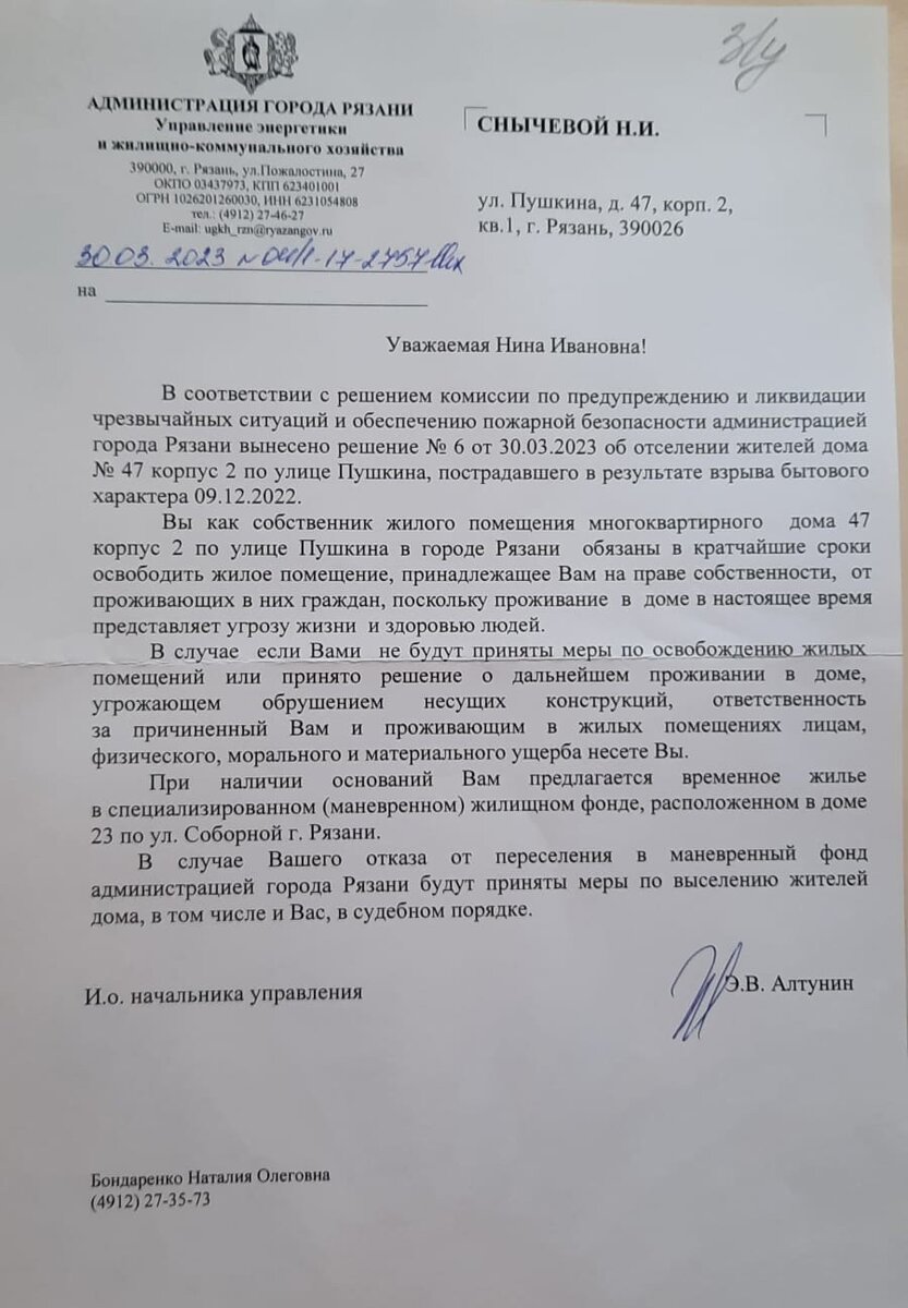 Жители частично разрушившегося дома № 47 на улице Пушкина сообщили РЗН. инфо, что получили письма от администрации города об экстренном выселении из квартир. В случае отказа рязанцам грозят судом и принудительным выселением. По словам Нины Сычевой, 4 апреля на улице сотрудники мэрии выдавали письма о расселении и просили жильцов поставить подписи. «Ситуация была странная. Жителей поджидали сотрудники администрации у входа в дом. Они ничего толком не объяснили, только просили расписаться за получение письма. Выяснилось, что нас хотят срочно выселить из дома, так как проживание в нем представляет для нас угрозу жизни и здоровья. Если откажемся, то нас принудительно, через суд, выселят», — сообщила рязанка. В документе говорится, что решение о выселении людей было принято 30 марта комиссией по предупреждению и ликвидации чрезвычайных ситуаций и обеспечению пожарной безопасности. Однако конкретные сроки, когда рязанцам нужно покинуть дом, не указаны. Также людям предложили переехать в мане