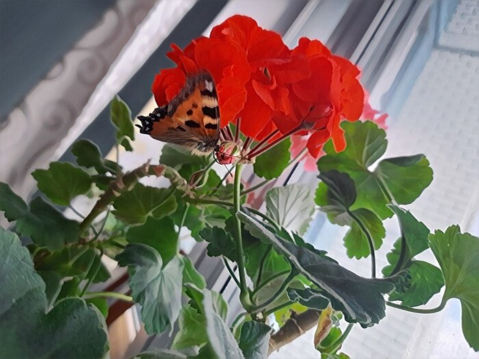 В конце марта жена гуляла с детьми и нашла на асфальте у дома бабочку. Первую, яркую, живую. Впереди как раз была арка, место, где всесезонно ветродуй и сквозняк. Нам так и показалось, что бабочка всеми своими силами держалась за этот мир: ветер задувал во всю, рядом пролетали колёса велосипедов, колясок, большие и маленькие гиганты оставляли следы на асфальте. Красавице-бабочке в округе не нашлось цветов с нектаром. А подснежники были далеко от нас. Искали ей местечко на клумбах: пусто, сильный ветер, уносит её обратно на асфальт, только уже на проезжую часть. Не нашли и... взяли с собой. Жена принесла ее домой, устроила на подоконнике. Нарезала ей дольки апельсина, выдавила сладкий сок на крышечку, представила цветам. На окошке у нас распустились герани: отнесли её в тепло, на красивые цветные зонтики. А дома она... тряслась в тишине и безветрии. Хрупкая жизнь, очень короткая. Как и у любого живого существа.Мы ей покушать дали, а она всё на улицу смотрит", - заметил старший сын. С та