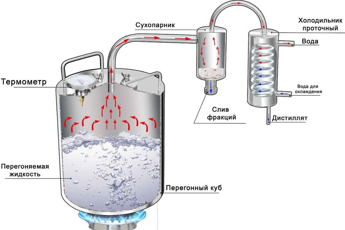 На рисунке изображен простейший аппарат с проточным охлаждением. Где горелка которая нагревает брагу которая находится в перегонном кубе. Брага испаряется и пар поднимается по отводной трубке и попадает в так называемый сухопарник, а потом в проточный холодильник, в который постоянно подается холодная вода, отводная трубка внутри холодильника закручена змеевиком для большей площади соприкосновения трубки с водой, а значит лучшего охлаждения паров. В холодильнике пары оставляют и превращаются в жидкость а точнее в 6-САМОГОН.