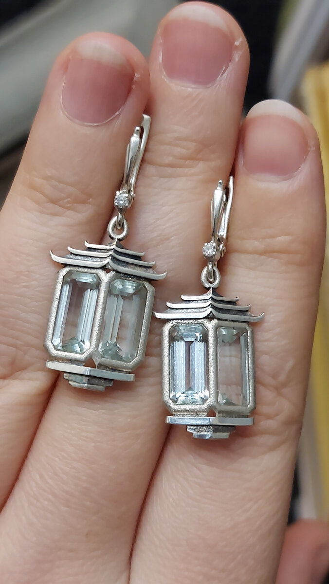 Всем доброго дня и хорошего настроения! Уверена, вы помните, что мы продолжаем развивать тему парусных морских путешествий, открытую нами этой зимой. Сейчас в разработке подставки к нашим драгоценным кораблям "Отважный" и "Огни святого Эльма". Обязательно покажем вам, когда они будут готовы. Почти завершен крошечный белый медведь на льдине в дополнение к композиции с кораблем "Отважный". Их вы тоже сможете скоро увидеть. А сегодня мы показываем серебряные серьги в комплект к паруснику "Огни святого Эльма". Мы их назвали "Свет дальних странствий". Доминантой украшения являются чистейшие гранёные аквамарины с Шерловой горы. Их общий вес составляет 10 карат. Швензы украшают 2 натуральных бриллианта диаметром по 1,5 мм. Их зарактеристики 3/4, 57 граней. Серьги созданы в технике 3д-моделирования. Все работы на компьютере выполнила Анастасия Маклакова, наш главный 3д-моделлер. Обратите внимание на интересную перекличку этих фонарей с крошечным фонариком на палубе судна. Да, они ра