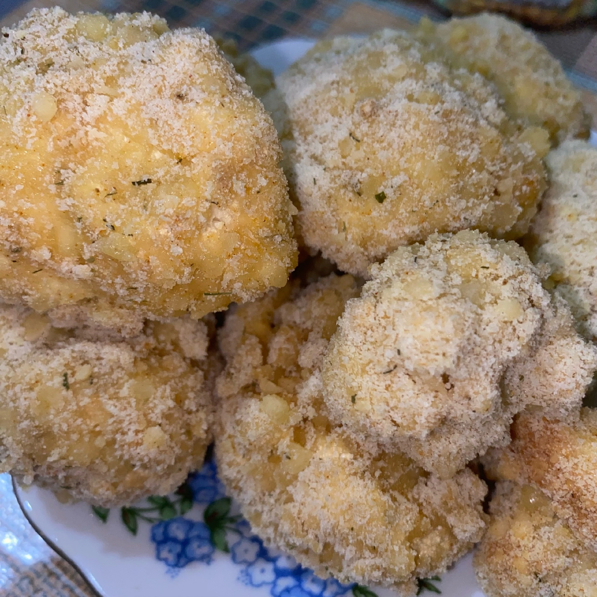 - Сыр натираем на мелкой терке и смешиваем с планировочными сухарями(для красоты и вкуса я добавила сушеный укроп и сушеный чеснок)
