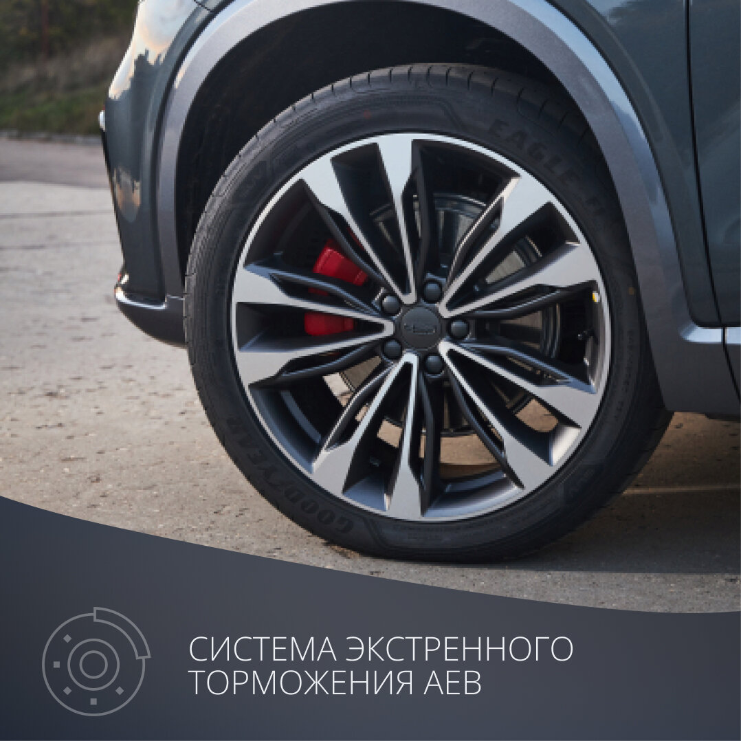Вы плавно движетесь в потоке на трассе, как вдруг машины перед вами резко начинают останавливаться. Не проблема: для таких ситуаций в Geely Tugella есть система экстренного торможения (AEB). Система AEB снабжена радаром, определяющим расстояние до препятствия, и камерой, распознающей объект на дороге. Поэтому она может предупредить водителя о риске фронтального столкновения с другим автомобилем (или иным объектом на дороге) звуковым сигналом и сообщением на дисплее. Если вы их проигнорируете, система автоматически остановит автомобиль — таким образом при определённых условиях и на скоростях до 50 км/ч можно предотвратить самые частые аварийные ситуации.