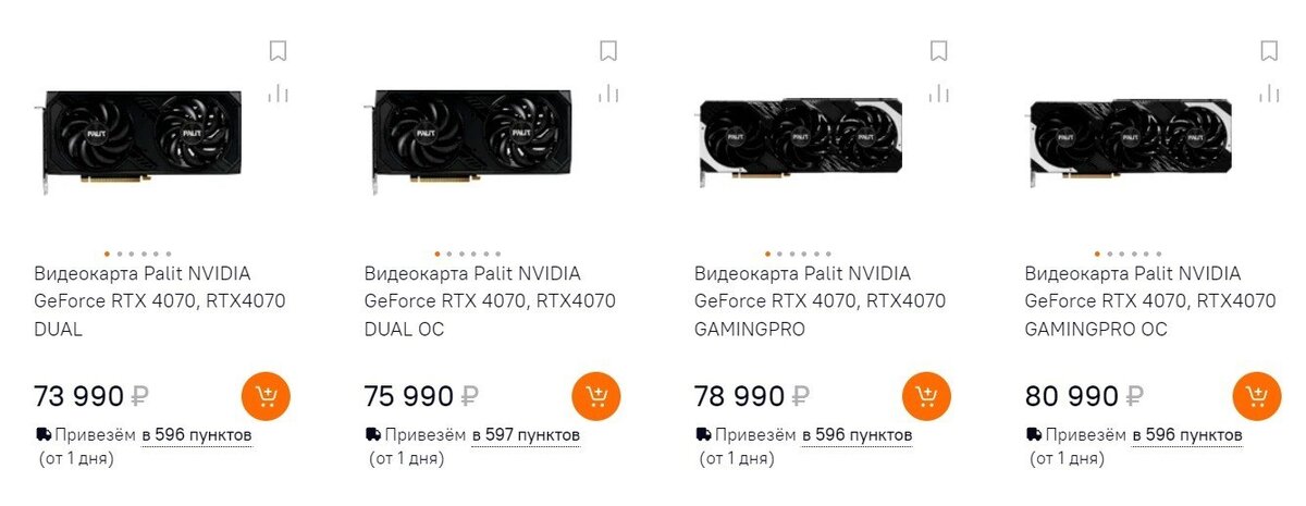 Ритейлеры в России начали продажи новой видеокарты GeForce RTX 4070 от NVIDIA, однако ее стоимость ожидаемо была завышена. Разница с рекомендованной ценой, по которой GeForce RTX 4070 можно приобрести в странах Европы, для россиян достигает 50%. Официальная объявленная цена новинки — $ 599 или порядка 49 тысяч рублей. Цены RTX 4070 в России / Источник: Citilink Хотя карта еще недоступна в DNS, ее можно приобрести в других магазинах, таких как Onlinetrade и Citilink. Российские ритейлеры предлагают только кастомные версии карты, ни на одной из платформ нет эталонных моделей GeForce RTX 4070 Founders Edition. Самая дешевая версия от производителя Palit — 72–74 тысячи рублей, MSI — минимум 74 тысячи рублей, а Gigabyte — 75 тысяч рублей. Источник: Onlinetrade Несмотря на то, что новая карта примерно на 20–25% медленнее, чем GeForce RTX 4070 Ti, разница в цене не так велика. Например, RTX 4070 Ti можно приобрести в DNS за 78 000 рублей, а минимальная цена карты на Onlinetrade — 83 000 рубле