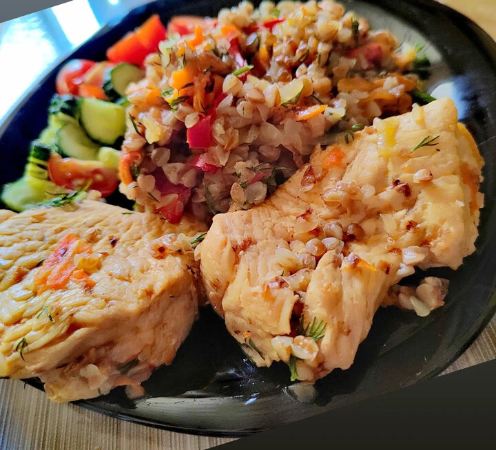 ✓ Вода ~ 250 мл. Филе режем на хорошие кусочки (получились примерно 3х8 см). На разогретой посуде, в которой будем готовить, «припечатываем» с обеих сторон до золотистой корочки, без масла. У меня толстостенная сковородка, похожая на вок. Укладываем мяско на дно, добавляем ложку масла, лук, болгарский перец, морковку, соль, перец, 50 мл воды. Тушим минут 5-7 или до выпарки влаги. Засыпаем гречку, добавляем воды 2:1 от гречки. На медленном огне варим 20 минут, выключаем, томим под крышкой минут 10-15. Специи можно любые, у меня соль, смесь перцев, французские травы, чеснок. Режем зелень и добавляем в гречку. Вкусненько. Салатик - по желанию. У меня черри и огурчик. Всем хорошего дня! Больше общения и рецептов - в группе "Рецепты для диабетиков" в ВКонтакте! Рецепт на странице