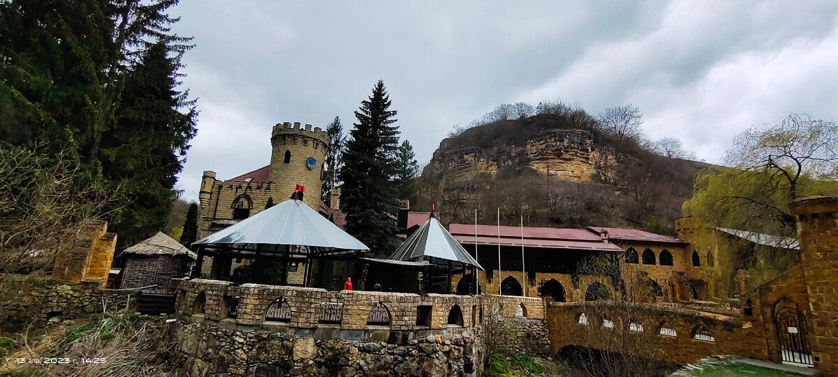А пока едем, я, вам расскажу легенду про замок коварства и любви. Жил злой хан, не помню имени. Сейчас посмотрю. Да и бог с ним, с именем. И была у него дочь, Даута, которую он с самого рождения ходил и лелеял. Но жила она под постоянным присмотром и из замка не выходила. Поэтому из своих ровесников, с детства она знала только сына пастуха Али. А потом они выросли и влюбились друг в друга. Но у Дауты уже был жених, богатый и старый, ну как всегда. Поэтому Даута с Али решили бежать. Но вслед была послана погоня. И влюбленные решили вместе спрыгнуть с обрыва. Али прыгнул первым, в Даута , увидев последствия прыжка не стала прыгать, и пошла замуж за старого богатея. Правда в браке прожила не долго, через два года умерла. Вслед за ней от горя окаменел ее отец. А еще говорят с тех самых пор мужчины и стали пропускать женщин вперед))))) Вот так. Что интересного в этом замке? А ничего. Ресторан, построенный в 1939 году. Который конечно красив, но я и красивее видела. Показывают скалу с которо