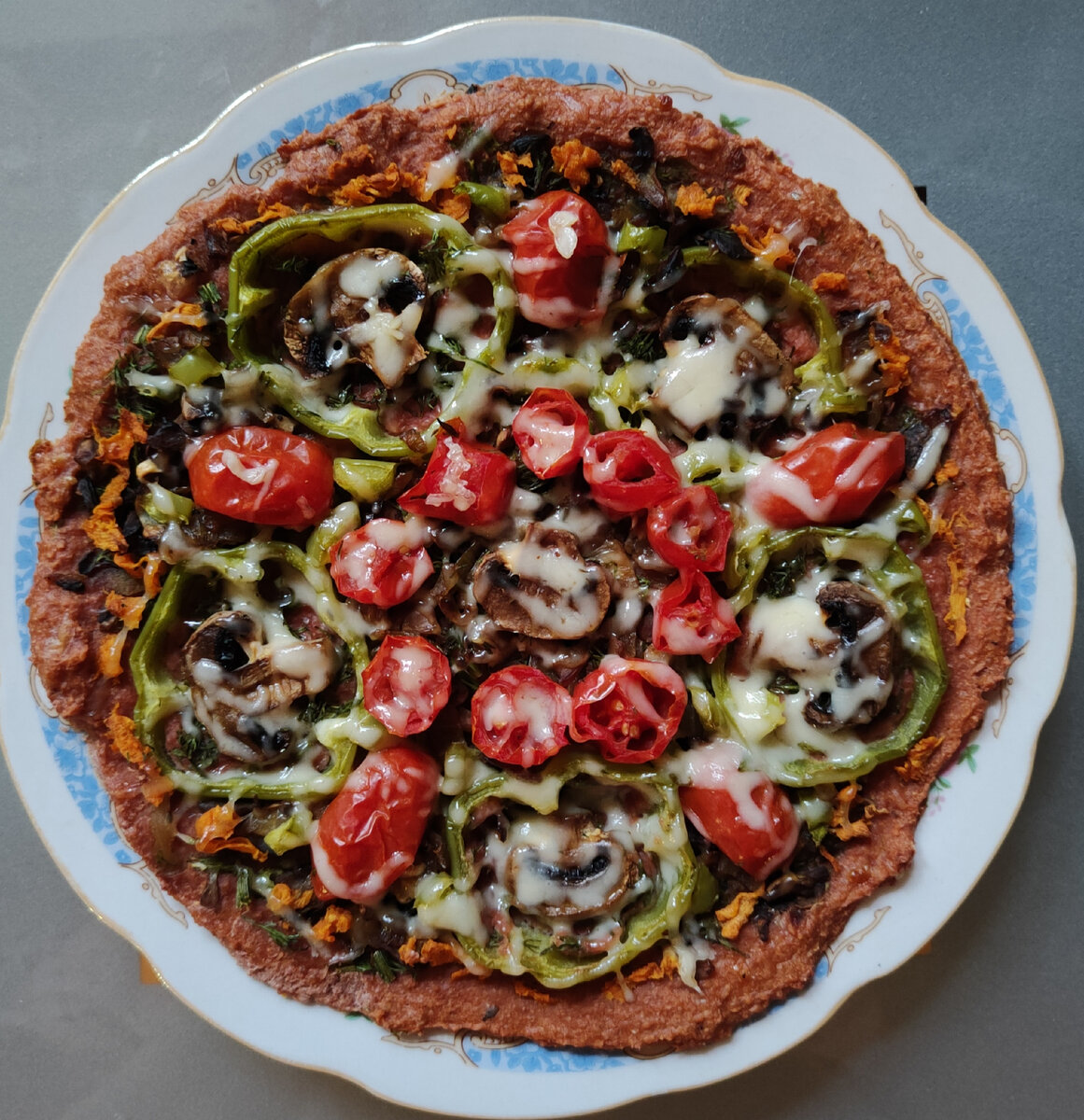Приветствую вас! Сегодня хочу предложить вам несколько блюд с грибами (шампиньонами). 1. Грибной суп-пюре. Его можно сварить и на мясном бульоне, а можно сделать и постным блюдом. Грибы, морковь, лук, зелень мелко порезать и обжарить на смазанной оливковым маслом сковороде (часть грибов нарезать пластинами для украшения) до готовности. Отложить грибы для украшения. Долить немного мясного, куриного бульона или воды и потушить ещё пару минут. Взбить в блендере. Украсить рукколой и грибами. 2. Овощная пицца с грибами (заглавное фото). Продолжение темы овощных пирогов. Основа - взбитые в блендере отварные овощи (цветная и краснокочанная капуста, мякоть томатов) с яйцом, овсяной и гречневой мукой. Вместо яйца можно взять крахмалистые овощи. Начинка - потушенные грибы с луком. Верхний слой - зелёный перец, томаты в собственном соку, грибы, тыква. Вместо сыра можно использовать пищевые дрожжи. Запекать в духовке до готовности. 3. Заливной пирог с овощами, курицей и грибами. Любые овощи на