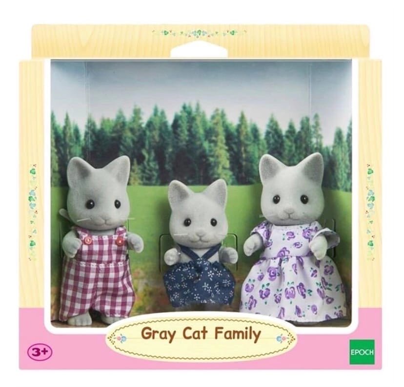 Фамилии у этих котов нет, так как они из бюджетной серии Сильвании и производители урезают расходы по максимуму, скупясь даже на имена. Эти коты - одна из моих любимых семей. Потенциал у котов прекрасный, но простенькая одежда не даёт им раскрыться в полной мере. Впервые набор вышел в 2009 году. В 2018 году он переиздавался и ещё совсем недавно продавался на алиэкспрессе, правда, уже исчез. В Россию коты завозились, но, судя по всему, в небольшом количестве, так как на авито встречаются не очень часто. Как и обычно, семья состоит из родителей и дочки. Отдельным набором выпускается сидящий малыш. Стоящего и ползущего малыша для этой семьи не существует, как и мальчика подростка и дедушки с бабушкой. Малыш, дочка и мама выпускались в дополнительных наборах. Мама - в наборе с кухней. Дочка - в наборе с ванной. Малыш - в наборе с зайчиком из семьи Ocher. Цвет у котов несложный, полностью совпадает с цветом серых кроликов и других серых котов, поэтому доноров для переделки подобр