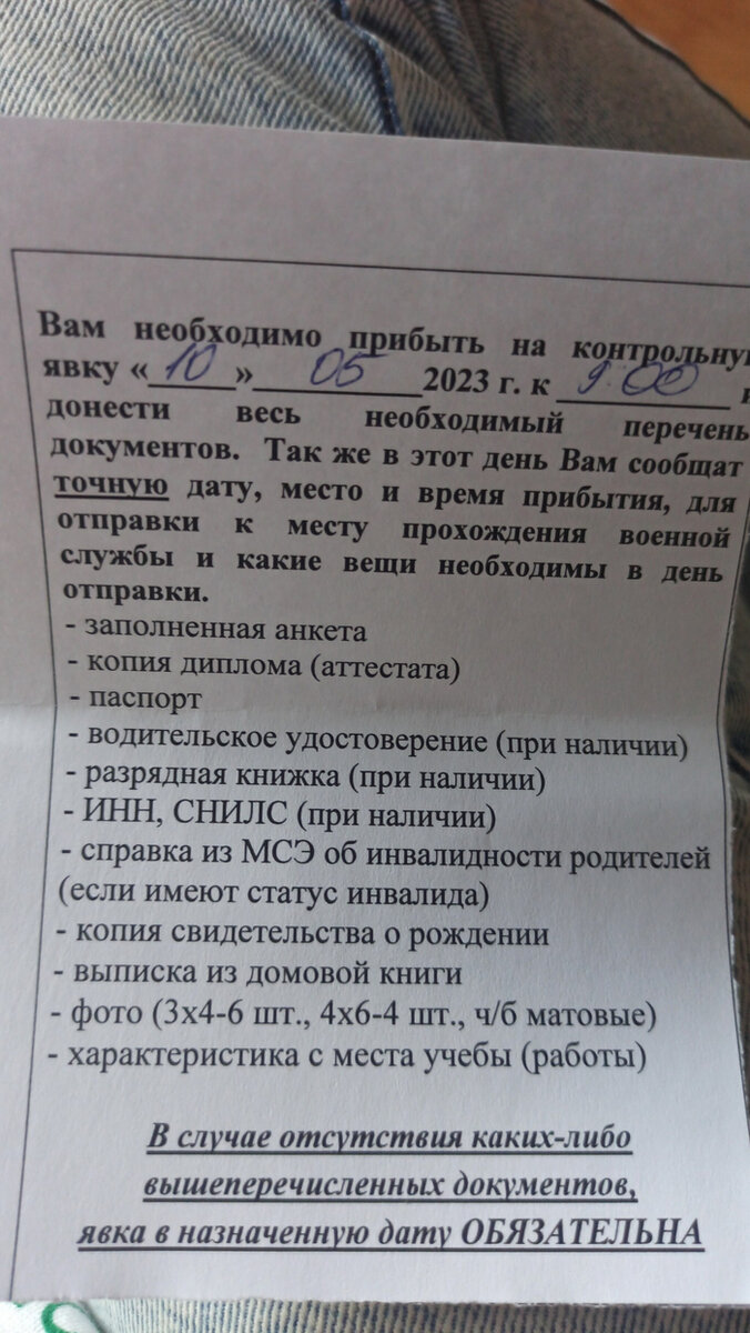 Сыну пришла повестка в военкомат "для уточнения данных учета". Есть отсрочка по обучению до 30.06.2023, подтвержденная свежей справкой по форме из учебного заведения. Пишет диплом сейчас и параллельно проходит медицинские обследования. Сегодня пришел в военкомат, предоставил справку и.... его отправили на прохождение медкомиссии. Заключений и обследований на руках не было, т.к. в повестке были указано только уточнение данных, а не медкомиссия. Через 6 часов мытарств комиссия приняла решение (копию отказались дать), выдала ему повестку на 10 мая (снова с формулировкой "уточнение данных"), памятку отбывающего в армию (!), запрос в колледж о дате проведения защиты диплома. В памятке указано что 10.05 ему сообщат дату отбытия. При этом ни категорию годности, ни род войск не озвучили, про приобщение исследований ничего не ответили. Что делать? Как получить копию решения? До этого было понимание, что во время отсрочки медкомиссии и призывные мероприятия не могут проводить. Место действия: во