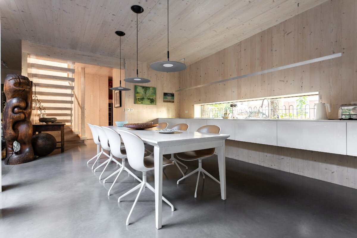«Это почти пассивхаус», — объясняет Аманда. (Пассивхаусы — это здания, созданные в соответствии со строгими стандартами энергосберегающего проектирования, так что в них поддерживается почти неизменная температура). «Но мы любим открывать окна пошире, поэтому технически мы не можем его так назвать. Но, тем не менее, экологические качества вполне соответствуют действительности. Использование древесины и деревянных труб для установки невероятно безопасно для окружающей среды. Это незначительная часть того количества стали или бетона, которое обычно используется в производстве и изготовлении», — объясняет она. Действительно, вы просто срубаете деревья, нарезаете их, используя лишь немного электроэнергии, а затем склеиваете их вместе. Так что с точки зрения отходов и использования ресурсов это поразительно. Мы использовали тройные стеклопакеты для окон, а в качестве утеплителя использовали стружку из древесных отходов. Даже бетонные полы, которые при застывании выделяют определенные газы, относительно экологичны, потому что они образуют теплоотвод, как горизонтальный радиатор. Как только пол нагревается, он остается теплым в течение долгого времени».