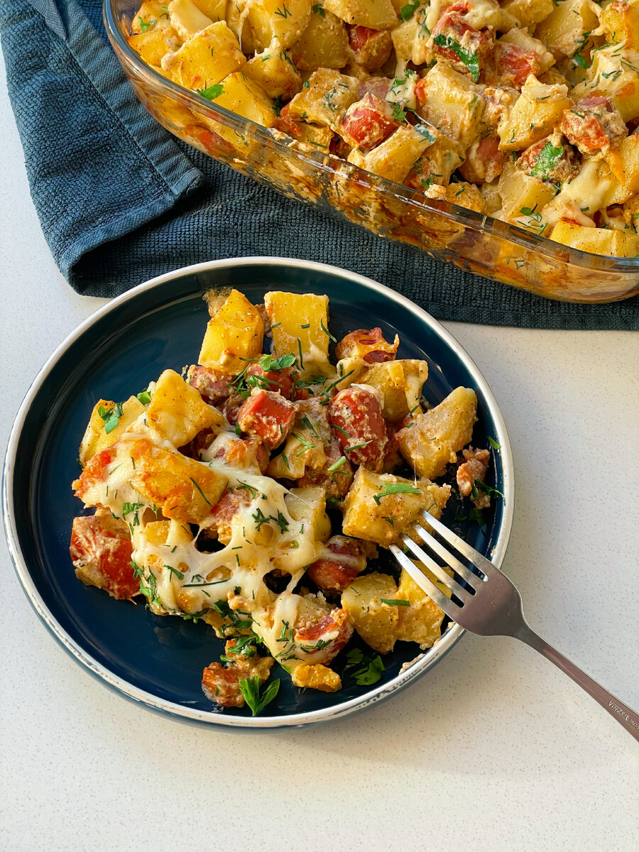 Ремонт так засосал, что из дзена аж на месяц пропала! 😅 Возвращаюсь, да еще и с новыми рецептами! Новая кухня доделана и я теперь как белый человек, с духовкой. Какое же это счастье - иметь духовку и нормальную плиту с 4 конфорками! Я почти 4 года прожила с одной конфоркой и готовила все это время на семью из 4 человек. Тушила вчера одновременно курицу в сливках и варила макароны на гарнир и размышляла о том, как мало нужно человеку для счастья, только чаще всего мы об этом даже не задумываемся))) Это все лирика, переходим к рецепту. А саму кухню, если хотите, я отдельным постом покажу 😊 Тут все просто и быстро, активной готовки минимум. Ингредиенты: Картофель почистить и нарезать небольшими кубиками. Колбаски и помидоры также нарезать. Соединить картошку, помидоры, колбаски и сметану. Добавить специи и перемешать. Если сметана густая, можно добавить немного воды. Переложить в форму для запекания, накрыть фольгой и отправить в духовку на 40-60 минут при температуре 180 градусов. З