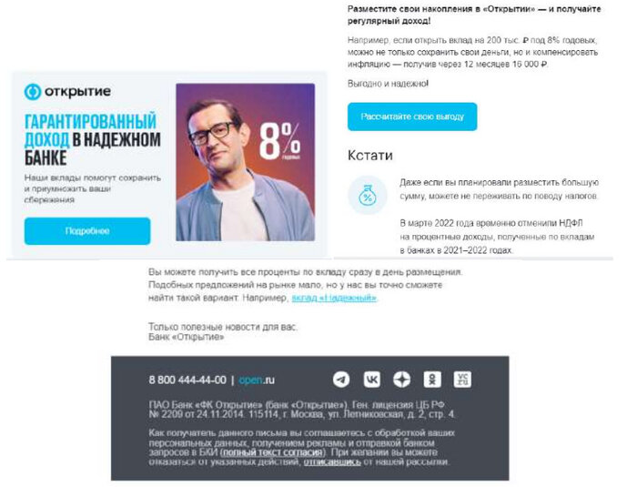 Начало истории В этот раз будет рассказ про email-спам. На него уже принято не обращать внимание, просто вести папку SPAM и никогда туда не заходить. Однако, email-спам тоже незаконен и за него можно наказать. Гражданин получил стандартный рекламный булшит от банка Открытие (отправитель bank@open.ru) на свою электронную почту. 8% Даже Хабенского заставили подвинуться. Так-то! Данные скриншоты были отправлены в ФАС с указанием, что данное письмо нежелательно и согласия на рекламу банку Открытие гражданин не давал. Акт 1. Открытие говорит, что это и не реклама вовсе Комиссия ФАС, рассмотрев жалобы приходит к выводу, что да - это реклама! Спасибо, Капитан ФАС и вызывает банк для разборов. Но банк то так просто не сломить. Представитель Открытия отбивается следующим маневром: ... Рассматриваемое сообщение представляет собой справочно-информационный материал и на такую информацию не распространяются требования Закона о рекламе. Сообщение содержит лишь сведения об оказываемых услугах и напра
