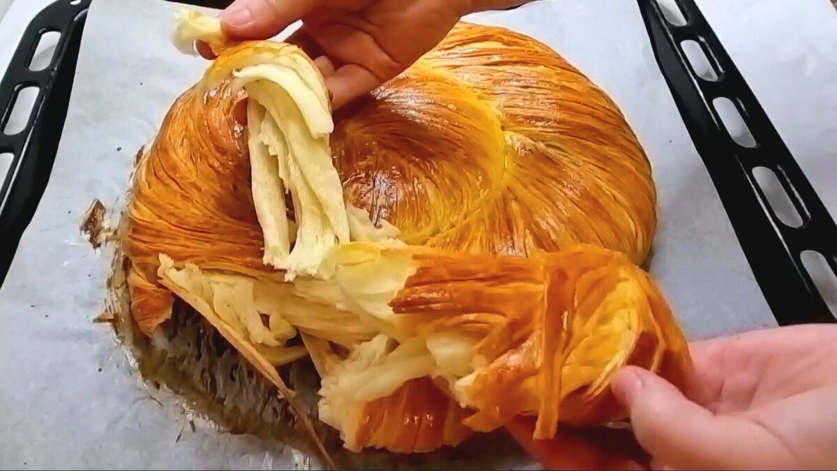 Рецепт приготовления и ингредиенты: 1,5 стакана молока (300 мл). 100 г сметаны. 1 чайная ложка соли (8 г). 7 г сухих дрожжей. 1 пакетик разрыхлителя (10 г). Хорошо смешать. 450 г муки. Хорошо вымешиваем тесто. Работаем с мукой. Замешиваем мягкое тесто, которое не липнет к рукам. Разделить тесто на 4 части. Делаем шарик из теста. Накройте и оставьте на 20 минут. 100 г растопленного сливочного масла. 100 мл растительного масла. Раскатать тесто по одному с мукой. Смажьте маслом. Складываем тесто. Смажьте маслом. Кладем последнее тесто и смазываем его маслом. Нарежьте тонкими полосками. Мы заворачиваем. Не забудьте ПОДПИСАТЬСЯ на мой канал и включить звонок. Выложить на пергаментную бумагу. Накройте и оставьте на 30 минут. Увеличьте скалкой. Выложить на противень. Добавьте к желтку 1 чайную ложку молока. Выпекать в разогретой до 180 градусов духовке до румяной корочки 35-40 минут. Все готово. Это просто и вкусно. Мне будет очень приятно, если вам понравится