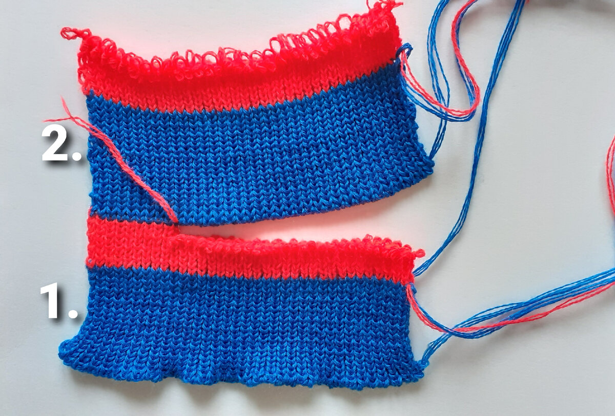 (Сравнение) Сравним набор петель на двухфонтурной машине. У меня "Каскад". 1. Набрала, как советует "руководство по эксплуатации", 1 ряд на самой малой плотности, (л/л),провела кареткой справа налево, получила зигзаг. Вставила прут, навесила грузы. Поменяла узор на круговое вязание (к/к), плотность-5/5. И связала резинку. 2. Продолжила вязать бросовой нитью 8 рядов. Заправила рабочую нить и проделала все по п.1. 3. Сравнила: 1 образец-край манжета волной. 2 образец-край ровный. Так и буду набирать с бросовой нитью.