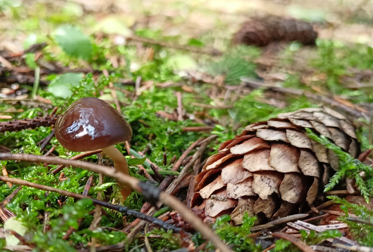 Начало апреля в лесу отметилось таянием снега. И хотя в скрытых тенью низинках еще белели примусоренные иголками и кусочками коры снежные пятна, на влажном, обогретом Солнцем мху появились первые весенние грибы. Маленькие блестящие колпачки Стробилюруса, или Шишколюба Съедобного ( на латыни Strobilurus esculentus) растут даже рядом с тающим снегом. Как и следует из названия, увидеть его можно исключительно вместе с упавшими шишками. Не более двух сантиметров в диаметре шляпки могут быть буро-коричневого, оливково-коричневого или каштанового цвета. Старея они подсыхают, становясь светлее - от серо-коричневых до охристых. Ножка полая, покрыта мелким пушком, кажется очень короткой, хотя 3 - 5 сантиметров виднеется лишь над мхом, в реальности она может оказаться и 15 сантиметровой, если шишка, которой питается гриб, глубоко погружена в почву. Растет гриб на еловых шишках во влажных местах еловых и лиственно-еловых лесов. Ареал охватывает все континенты, где встречается ель. С наступ