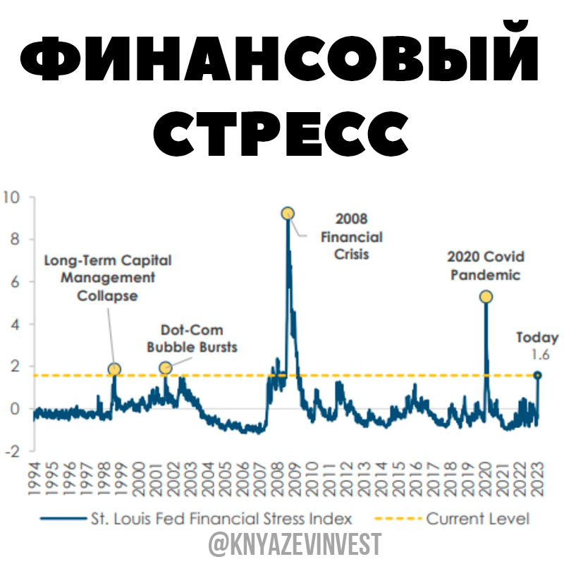 Уровень "Финансового стресса" соответствует значениям краха доткомов или краха 1998 года. И обычно такие уровни - верный признак наступления рецессии.