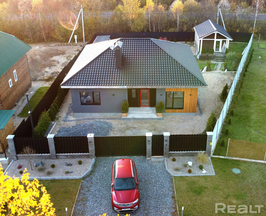 В 24 километрах от Минска продается стильный загородный дом на 111 квадратных метров. В нем реализовано много интересных дизайнерских идей, которые многим понравятся. Например, для фасада выбрали оригинальное сочетание разнородных материалов и удачно подобрали цвета. В интерьере «цепляют» бетонные и реечные потолки, встроенные в стены светодиодные полосы, дизайнерская мебель. Сможете угадать, сколько стоит такой коттедж? Находится он в деревне Новое Поле в Раковском направлении — в новой застройке с современными домами. В деревне развитая инфраструктура: ясли-сад, школа, аграрно-экономический колледж, амбулатория, аптека, почта, магазины и даже историческая достопримечательность — усадебный комплекс Друцких-Любецких. Добраться сюда можно по трассе М6 всего за 20 минут от МКАД. Сюда ходят маршрутки и и автобусы. Новая застройка обеспечена практически всеми необходимыми для комфортной жизни за городом коммуникациями: газ, центральный водопровод, электричество (15кВт), оптика от Белтелеко