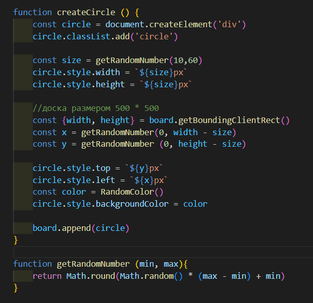 1. Начнём с создания переменных: const circle = document.createElement('div') 2. Зададим функцию, которая будет генерировать рандомные числа: function getRandomNumber (min, max){ return Math.round(Math.random() * (max - min) + min) } //допустим, что у нашего обьекта вот такие размеры const size = getRandomNumber(10,60) circle.style.width = `${size}px` circle.style.height = `${size}px` 3. Далее нам нужны константы, которые всегда будут находиться в пределах нашего поля и нам не нужно будет каждый раз вводить значения ширины и высоты const {width, height} = board.getBoundingClientRect() 4. Из этих констант и метода генерации рандомных чисел мы получаем x и y и для того, чтобы избежать ошибок лучше еще и вычесть сам размер переменной const x = getRandomNumber(0, width - size) const y = getRandomNumber (0, height - size) // задаём размеры circle.style.top = `${y}px` circle.style.left = `${x}px` Всё это можно завернуть в одну функцию создания формы и вызывать её по клику. Д
