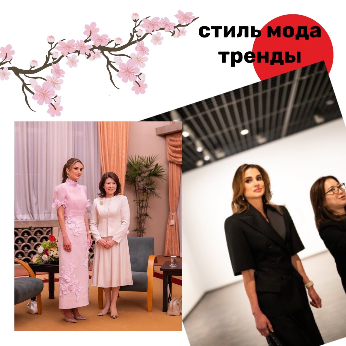 Расцвела Рания в поездке! Официальный визит королевской семьи, которую Его Величество Абдалла Второй вывез в Страну Восходящего солнца, очень интересен мне именно с точки зрения новых образов королевы. Подданные в родной стране вряд ли бы одобрили такое ( обратила внимание я на прозрачный топ от Zimmermann). А вот за границей королеве можно одеться и чисто по-европейски. Причем, по последней моде. Все наряды из самых свежих коллекций ведущих кутюрье. Особенно мне понравилось, как была одета Ее Величество при встрече с супругой премьера Японии. В стране завершается период всеобщего любования цветущей сакурой и Рания подобрала комплект— блузу и юбку с цветами чисто оттенка цветущей вишни. Дом Zimmermann, весенне-летняя коллекция линии «Отдых» на этот год. Кроме того, королева порадовала своих поклонниц очень красивым черным брючным комплектом и алыми туфельками-стилетто, когда прибыла в Национальный музей для осмотра новой экспозиции. Этот брючный костюм мы уже видели с вами- но тольк