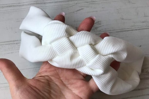Использовать можно не только трикотаж, но и любую не растяжимую ткань. Отрезать 3 полосы размером 6х60 см, подготовить 1 прямоугольник 36х13 см и кусочек резинки шириной 2,5 см длиной 17 см. Получится повязка на взрослый размер головы.