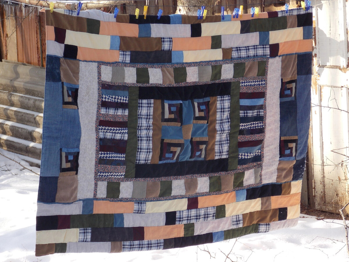Материал: джинс, вельвет, лён, хлопок. Прослойка - синтепон. Изнанка - лён. Размер 2х1,5 м.