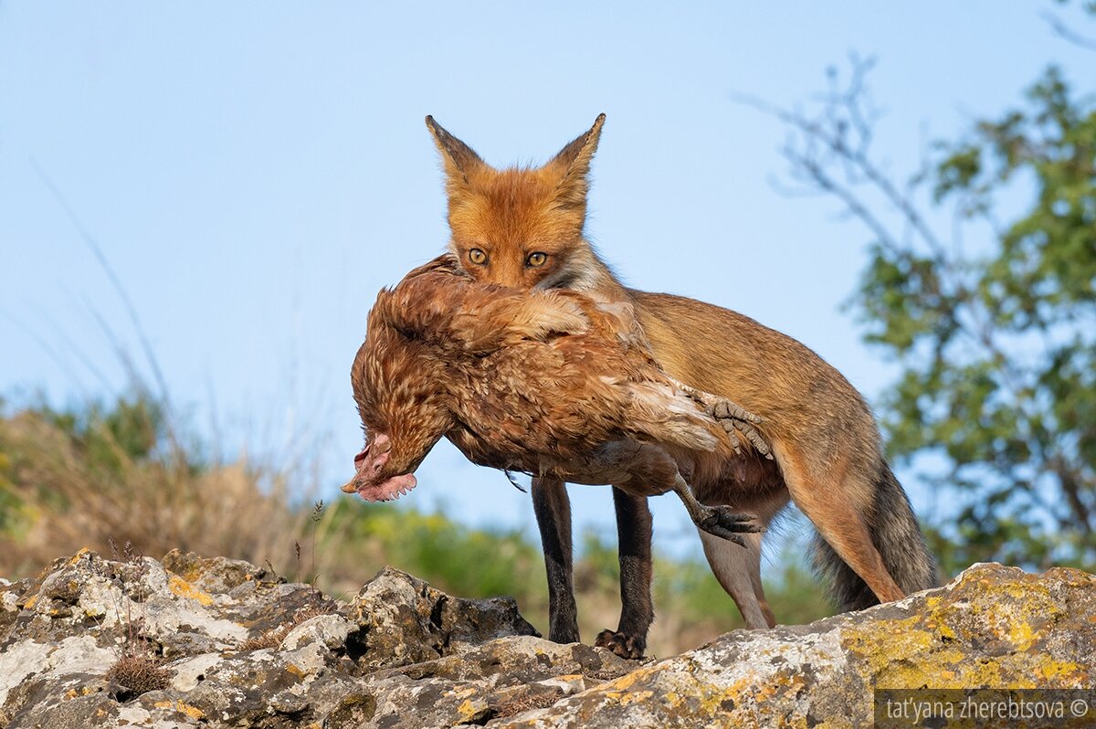 Многие читатели нашего канала помнят серию публикаций о лисе-героине выкормившей 14 лисят. Вот это, не побоюсь этого слова, уникальное архивное видео: Эта лиса вывела потомство возле достаточно оживленной дороги и неподалёку от дачных кооперативов. Учитывая количество щенков, лиса не нашла лучший способ выкормить эту ораву, как просто выходить на обочину и клянчить еду у проезжающих мимо местных жителей. И этот план сработал. Практически каждый день ей привозили подаяние в виде разных кормов. Большинство лисят успешно выросло и лиса, которую мы старались регулярно отслеживать, пропала. Последний раз мы видели её около 7 месяцев назад. И вот, буквально вчера, мы остановились возле цветущих кустов, что бы поснимать местных пернатых в красивом антураже, но дело как-то не шло. Птицы почему-то наотрез отказывались лететь в нашу сторону. Рассматривая верхушки и совершенно случайно кинув взгляд вниз кустов, сразу поняли причину игнора. Из кустов, стоя на камне, нас внимательно разглядывала н
