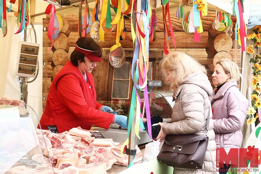 В ближайшее воскресенье православный мир отметит светлый праздник Пасхи, поэтому уже сегодня, 14 апреля, в нескольких точках города начали работу тематические ярмарки. Корреспондент агентства «Минск-Новости» отправилась на одну из локаций к городской ратуше и узнала, что там можно приобрести. Торговые ряды на Немиге расположились в Верхнем городе между рестораном «У ратуши» и Свято-Духовым кафедральным собором. На первый взгляд кажется, что палаток здесь немного, но ассортимент в каждой из них впечатляет. На столичную ярмарку привезли свою продукцию районные потребительские общества со всей страны. К примеру, продавцы из Баранович устроили мясной бум: здесь и рулеты из курицы, и колбасы, и домашняя солонина. Белыничское райпо не отстает: у них в палатке много свинины, аппетитный фарш, колбаски и баранина. Мясная продукция из Гомеля тоже впечатляет – к Пасхе можно закупиться окорочками в маринаде, свиными почками. Слонимчане порадовали большим выбором сала и полендвицы. Здесь же сыровял
