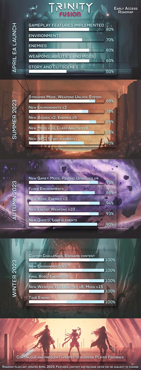 Студия Angry Mob Games выпустила в ранний доступ на ПК научно-фантастическую метроидванию с элементами "рогалика" Trinity Fusion, где игроков ждут три параллельные вселенные, каждая из которых обладает собственным сеттингом с процедурно-генерируемыми уровнями и персонажем с уникальными способностями. В честь выхода игры разработчики представили новый трейлер, где можно увидеть фрагменты игрового процесса. https://www.youtube.com/watch?v=dmUIwWI9zDs В раннем доступе Trinity Fusion уже доступно только 8 биомов, 38 видов оружия и 52 уникальных типа противников. Команда Angry Mob планирует выпустить полноценную версию игры через 12-18 месяцев, а до этого момента она постепенно будет наполнять экшен-рогалик контентом. Разработчики даже уже представили дорожную карту развития игры на 2023 год.