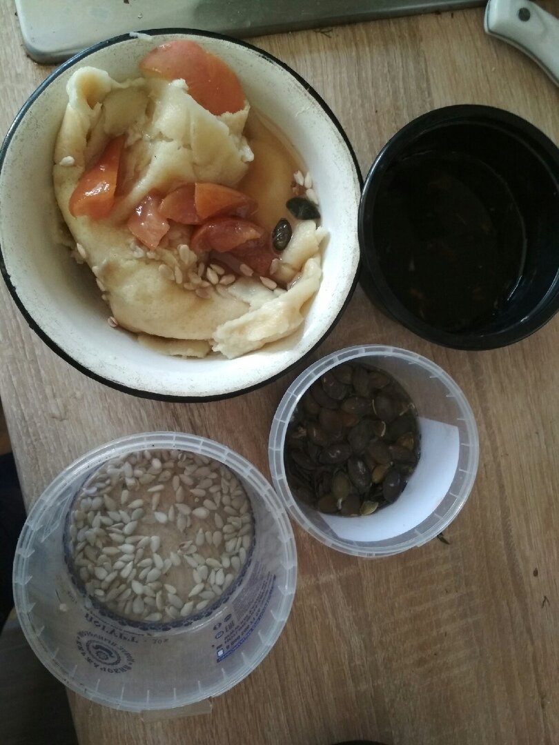 Лён, подсолнух и штирийская тыквенная семечка. Замачивание позволяет легко почистить подсолнух, снять сорность и оживить семена. Совсем другой вкус и ощущение. Можно в салат, гарнир, выпечку десерт. В данном случае сладкий обыгрыш с вареньем, блинами и яблоком.