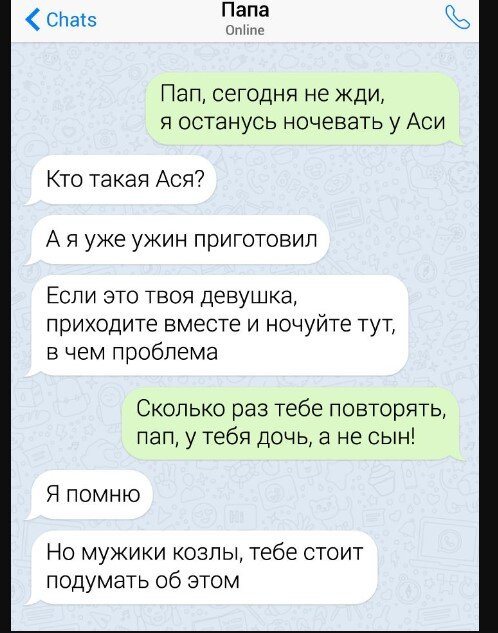 Родители сталкиваются с множеством трудностей в процессе воспитания детей, но они уверены, что их усилия не пропадут даром. Когда дети становятся взрослыми, родители радуются тому, что могут говорить с ними на одном языке и быть более честными. Мы уважаем людей, которые обладают хорошим чувством юмора, и полагаем, что более свободное общение и отсутствие скрытых комплексов способствуют улучшению отношений и здоровья. В нашей подборке представлены родители, которые могут показать нам, как остроумно, ярко и необычно формулировать свои мысли. Они показывают, что общение с детьми может быть не только полезным, но и забавным. К тому же, хорошее чувство юмора помогает родителям поддерживать позитивный настрой и эмоциональное равновесие в сложных ситуациях. Какой заботливый папа! Он не только готовит ужин, но и предлагает своей дочери альтернативу. Жаль, что дочь не ценит его мудрость и опыт. Надеюсь, она не пожалеет о своем выборе. Какая же классическая ситуация! Сразу вспоминаются советские