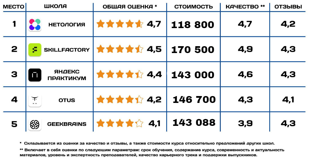 При составлении рейтинга мы учитывали: педагогов, общую программу курса, отзывы выпускников и истории успеха, продолжительность программы и цену. Также немаловажным фактором являются: наличие карьерного трека, возможности получить налоговый вычет, сроки обучения и мнения сторонних экспертов.