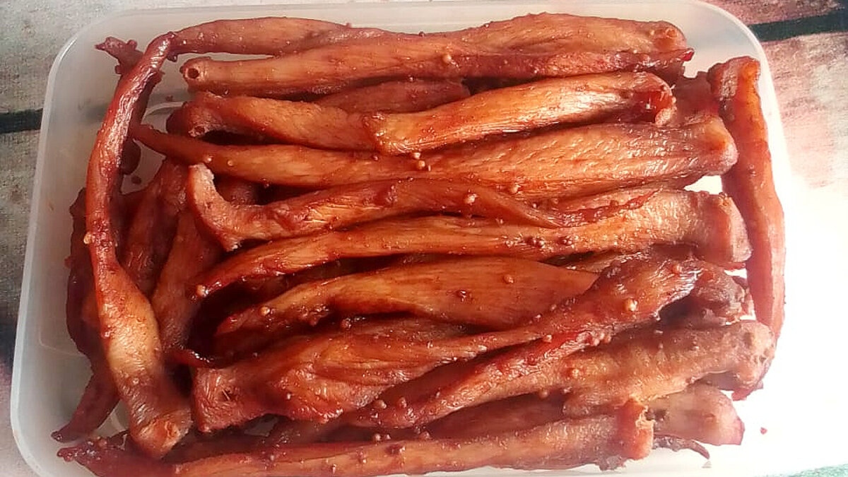 🛒Нам понадобится Филе куриное 1 кг (примерно 5 некрупных штук) 🔸Для маринада Соевый соус 5 ст. л. Паприка 1 ст. л Сушёный чеснок 1 ч. л. Французская горчица 2 ч. л. Раст. масло 2 ст. л. 📖Как приготовить: ✔️Смешать все ингредиенты маринада ✔️ Нарезать филе на тонкие полоски и отправить в маринад на два часа ✔️Мясные полоски нанизать на деревянные шпажки и просунуть в решётку духовки ✔️Вялить три часа при температуре 50 градусов. Духовку полностью не закрывать. Я делаю зазор с помощью толстой деревянной ложки, или можно включить режим с обдувом