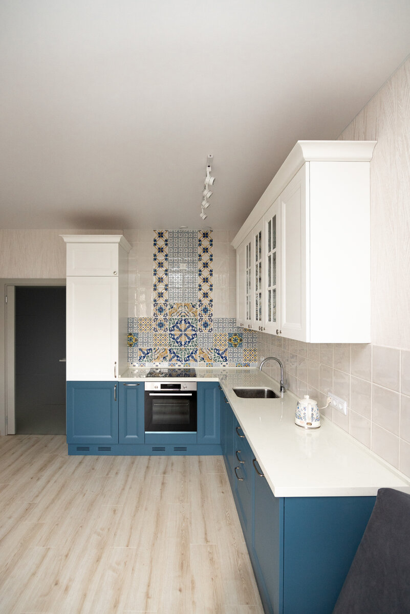Кстати, контрастные цвета шкафов напоминают гжелевские мотивы. Среди такого интерьера сразу хочется стать утонченной натурой, которая на светских вечерах у себя дома рассказывает всем, что знакома с Пикассо через одно рукопожатие, и именно он придумывал и рисовал узоры на фартуке.