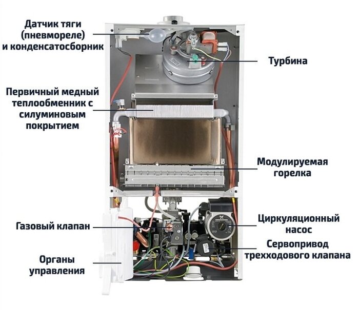 Начал на днях мой газовый котел Baxi Eco Four 1.24F постоянно выдавать ошибку e03. Поработает 5 минут - выдает ошибку, остановится, подумает 5 минут, потом ошибка пропадает - он снова запускается, и так по кругу. Котлу около 5 лет, ТО делалось не регулярно. Решил я прежде чем вызывать мастеров и платить им бабло - попробовать самому провести диагностику. Благо в интернете и на тытрубе по этой ошибке куча инфы. Ошибка e03 поступает с датчика тяги дымохода и сигнализирует о недостаточной тяге. Фотка полуразобранного котла из инета для примера (свой я забыл в процессе фоткать, а потом было лень) Интернет сказал, что основных причин для появления этой ошибки несколько: заужен дымоход - забит мусором, льдом или неправильно смонтирован; не крутиться или плохо крутится вентилятор турбины; оплавилось устройство (Эйса) Вентури; проблема с датчиком тяги; конденсат в трубке между вентилятором и датчиком тяги; проблема с контактом между вентилятором или датчиком тяги и системной платой; проблема в