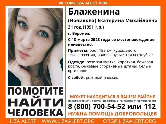 Материалы об исчезновении многодетной матери в Воронеже передали в СК. Об этом сообщают местные СМИ со ссылкой на пресс-службу ведомства. 31-летняя Екатерина Блаженина пропала в облцентре в марте. Активные поиски горожанки ведутся с 13 апреля. В день пропажи она ушла на работу, но домой так и не вернулась и перестала выходить на связь. Пропавшая ростом 159 см, худощавого телосложения, волосы русые и голубые глаза. Одета была в розовую куртку, бежевую кофту, такого же цвета спортивные штаны и белые кроссовки. С собой у нее был белый рюкзак. Обращаться с информацией о Екатерине можно по номерам в ориентировке.