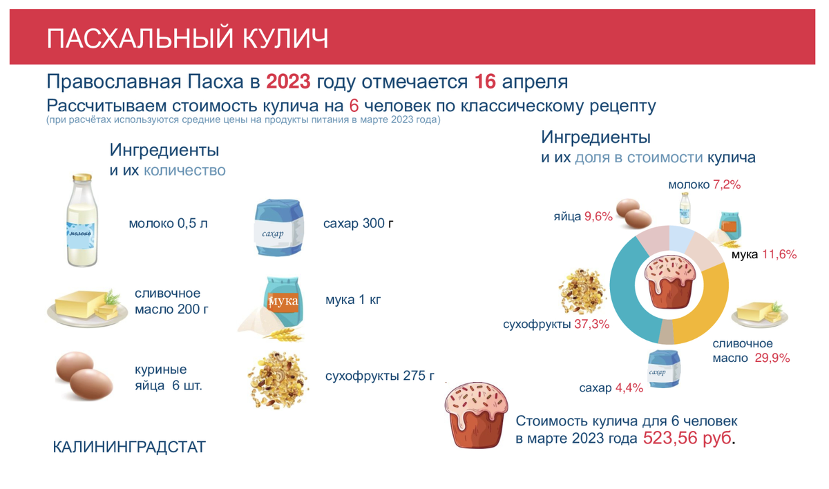 В Калининградской области в 2023 году общая стоимость кулича увеличилась на 3,6% по сравнению с прошлым годом. Об этом сообщает Калининградстат. «За основу взят классический рецепт приготовления пасхального кулича. Количество ингредиентов в рецепте рассчитано на 6 человек. При определении стоимости брались средние цены на продукты в марте в период с 2014 по 2023 год. Рост стоимости кулича произошел, главным образом, за счет повышения цены на сухофрукты — по сравнению с мартом прошлого года она выросла на 19,9%, уточняют в ведомстве. Самые «весомые» по цене ингредиенты при выпечке кулича — сливочное масло и сухофрукты. В марте нынешнего года их доля в стоимости составила 29,9% и 37,3% соответственно. На третьем месте мука — 11,6%. Цены на другие ингредиенты за двенадцать месяцев или выросли незначительно: молоко (+ 1,7%), сливочное масло (+ 1,8%), или снизились: мука (- 7,2%), сахар-песок (- 21,6%), яйца (- 11,6%). Данные Калининградстата