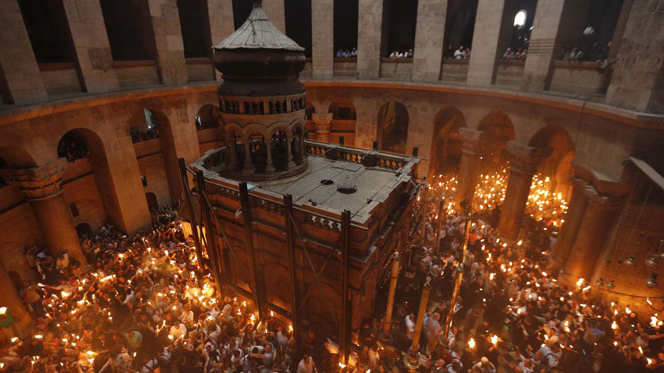 Великая Суббота Прп. Тита чудотворца (IX). Мчч. Амфиана и Едесия (306). Мч. Поликарпа (IV). Чудо схождения благодатного огня В Великую Субботу совершается воспоминание погребения Иисуса Христа, пребывания Его тела во гробе, сошествия в ад для возвещения там победы над смертью и избавления душ, Его ожидавших. Вспоминается также благоразумный разбойник, первым призванный в рай. Каждый год в этот день в Иерусалимском храме Воскресения, который накрывает своей громадной кровлей и Голгофу, и пещеру, в которой был положен Господь, и сад, где Мария Магдалина первой встретила Его воскресшего, происходит чудо схождения Благодатного огня. Это бывает только накануне православной Пасхи, хотя празднуется она каждый год в разные дни по старому Юлианскому календарю. …Примерно в полдень со двора Иерусалимской Патриархии начинается крестный ход во главе с православным Патриархом. Процессия входит в храм Воскресения, направляется к Кувуклии – часовне, возведенной над Гробом Господним, и, трижды обойдя е