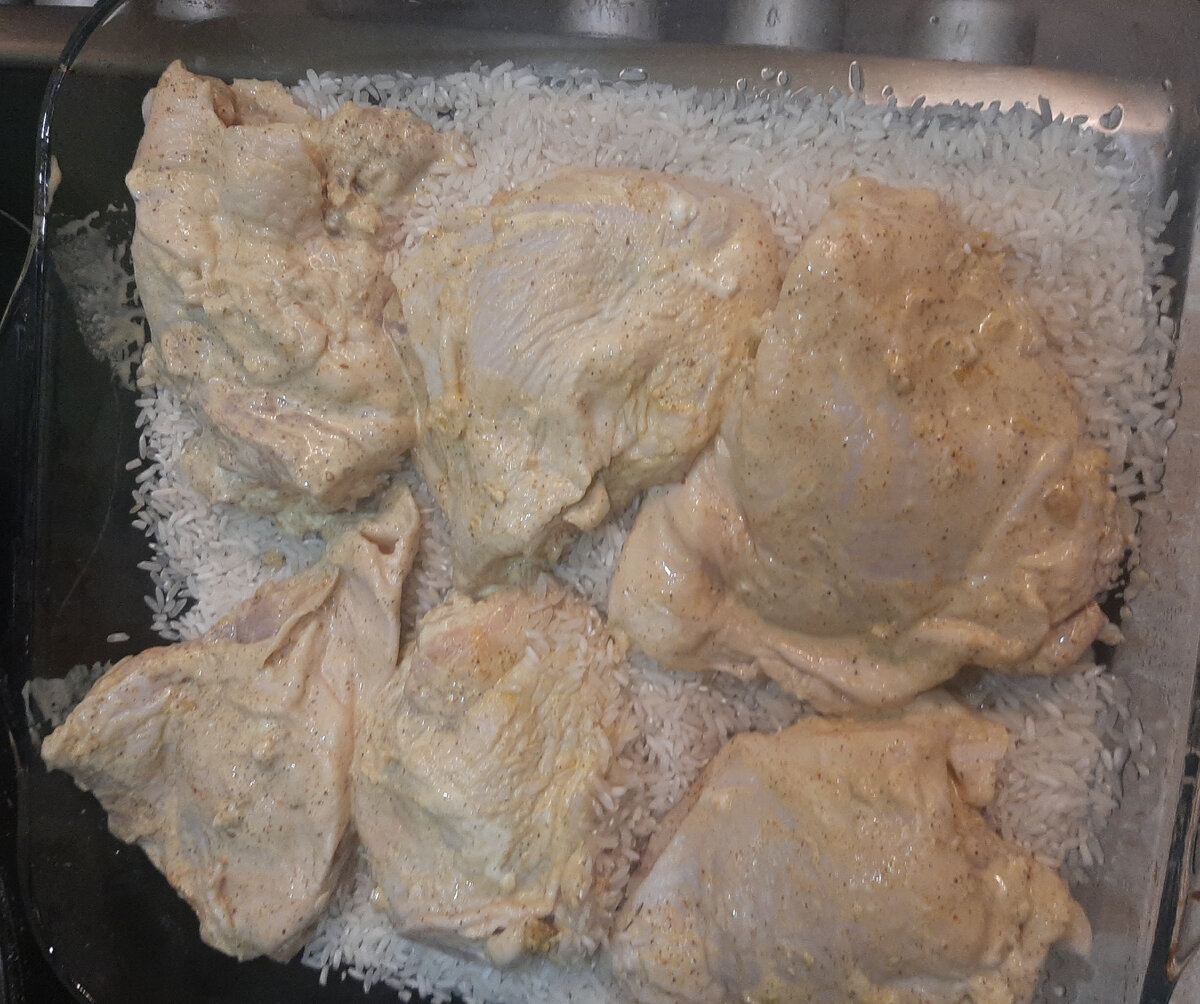 И так для этого нам понадобиться 5 куриных бедрышек. Я их замариновать.Для маринада;4 зубчика чеснока специи по вкусу ,майонеза. И поставила в холодильник на 2 часа ,чем больше тем лучше. 2. Далее промыла шампиньоны, Разрешила на две половинки и тоже замариновать в майонеза. Снова в холодильник на 2-3 часа для промариноваться. 3.Беру стеклянную.форму, предварительно смаываю масло и засыпаю её рисом. 5.Сверху выкладываю беда и шампиньоны 7.Заливаю водой с разбавленным кетчупом иди томатной пастой. И ставлю в духовку на 200С до готовности. Приятного аппетита. Не забываем в конце подписываться!!!
