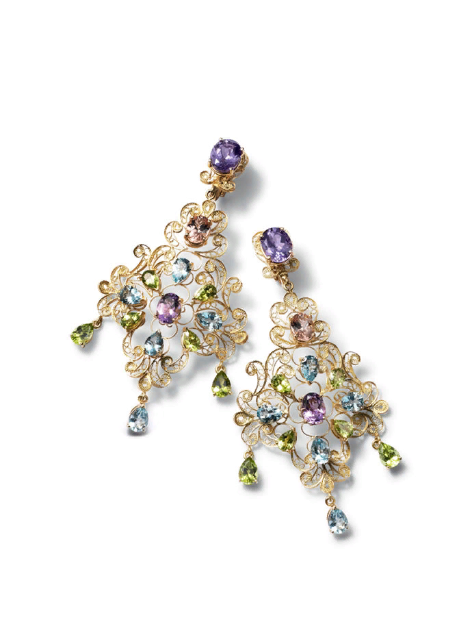 Желтое золото и рубины, белые и синие сапфиры перекликаются с трогательной экзальтированностью форм и фактур — не обошлось без полюбившейся многим средиземноморской филиграни, которой было так много в бижутерии последние пару сезонов. Черпая вдохновение от королевских украшений сицилийских дам, филигранные и разноцветные камни и по