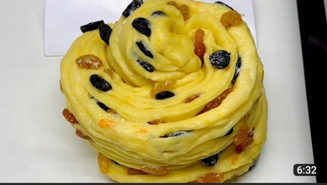 Ингредиенты Яйцо- 6 шт Мука - 6 ст Молоко - 500 мл Растительное масло - 100 мл Изюм - 300 гр Сахар - 2 ст Дрожжи 8 гр Ванильный сахар 10 гр Для приготовления такого кулича, опару делать не нужно, сразу замешиваем тесто. Изюм залейте горячей водой, что бы он рязмяк. Яйцо соединити с сахаром и ванилином, хорошо взбейте миксером до однородной массы. Затем вылейте молоко, желательно теплым и добавьте дрожжи. Перемешайте Затем постепенно добавляйте муку, помешивая, так не будет комочков. Готовое тесто положите в кастрюлю, смажьте ее маслом, что бы тесто хорошо поднялось, оставьте в теплом месте на 1,5 - 2 часа. Разделить тесто на 2 части. Присыпьте рабочую поверхность мукой и раскатайте в очень тонкий пласт. Смажьте сливочным маслом. Распределите поверхности 1/2 изюма. Закрутите тесто в колбаску и уберите в сторону. Повторите процесс с второй части теста. Каждый рулет разрежьте острым ножом посередине вдоль, закрутите спиралью одну половинку рулета и вторую. Наполните тест