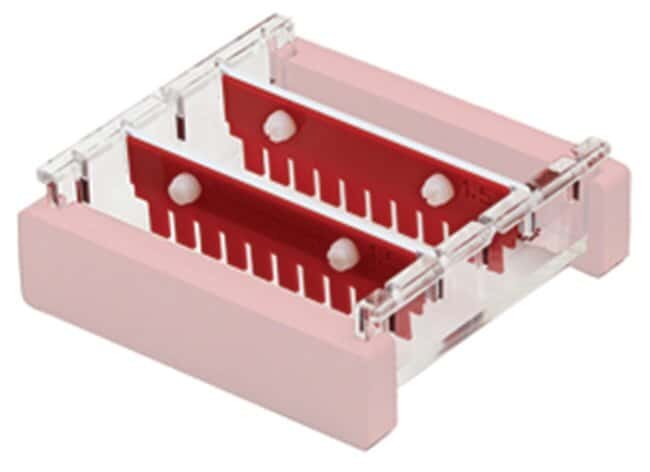 5) После того, как гель затвердеет, можно вытащить гребенки. Гель будет выглядеть примерно вот так. Если у вас больше лунок, чем пробирок с ПЦР-продуктом, то гель можно порезать лезвием, и часть оставить на следующий раз. Гель можно хранить в холодильнике в пластиковом контейнере, залив буфером.