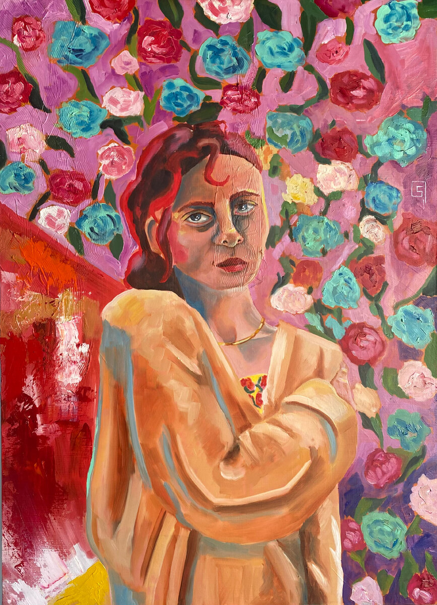 Картина из серии работ «родом и панельки» Сюжет картины может показаться не замысловатым, но это не так. Как и во многих картинах тут рассказывается история. История о любви к себе. И это именно тот момент, когда человек понимает что он действительно прекрасен и ему не нужно следовать каким-то стандартам, ведь внутри он уже полон цветов. На это нам намекает одеяние под свитером и закрытая поза. Девушка робко показывает себя и делает свой первый шаг в проявлении своей самости. Она не хочет подстраиваться под окружающий мир и становится с ним одним целым, она уже цельная личность, которой есть что сказать этому миру. И она не примерно раскроит свой потенциал полностью.