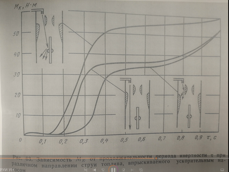 ИТАК, - МИНИМАЛЬНАЯ ПРОДОЛЖИТЕЛЬНОСТЬ ПЕРИОДА НЕСТАБИЛЬНОСТИ РАБОТЫ ДВС 0,16 с получается, когда СТРУЯ ТОПЛИВА ПОПАДАЕТ НА ОСЬ ДРОССЕЛЬНОЙ ЗАСЛОНКИ! Если струя проходит между заслонкой и стенкой смесительной камеры, попадая в нижнюю часть впускного тракта, период инертности (нестабильности) увеличивается до 0,20 с При попадании на стенку малого диффузора этот период возрастает до 0,27 с. Система холостого хода (СХХ), главная дозирующая система (ГДС), экономайзеры, переходная система способны поддерживать ОПТИМАЛЬНЫЙ СОСТАВ топливо-воздушной смеси (СМЕСИ) ТОЛЬКО НА УСТАНОВИВШИХСЯ РЕЖИМАХ или режимах плавного изменения нагрузки и оборотов ДВС. НА НЕУСТАНОВИВШИХСЯ РЕЖИМАХ, при увеличении частоты вращения коленчатого вала ПОЯВЛЯЕТСЯ НЕСТАБИЛЬНОСТЬ ПРОЦЕССОВ СГОРАНИЯ из-за переобеднения или перобогащения смеси. ПЕРИОД ИНЕРТНОСТИ и НЕСТАБИЛЬНОСТИ в зависимости от прогрева ДВС составляет 0,18-0,4 с. Продолжительность периода нестабильности зависит от многих факторов, в том числе от ЗАКОНОМЕРНОСТИ ПОДАЧИ ТОПЛИВА УСКОРИТЕЛЬНЫМ НАСОСОМ (УН) и НАПРАВЛЕНИЯ СТРУИ. Специалистами НАМИ на специальном моторном стенде проведены исследования по влиянию различных факторов на интенсивность роста оборотов карбюраторного двигателя, в том числе был получен ГРАФИК ЗАВИСИМОСТИ КРУТЯЩЕГО МОМЕНТА от различного направления струи топлива, впрыскиваемого УН, т.е. КАК УСКОРИТЕЛЬНЫЙ НАСОС СОКРАЩАЕТ ПЕРИОД НЕСТАБИЛЬНОСТИ НА РЕЖИМЕ РАЗГОНА, СВОДЯ ЕГО К МИНИМУМУ.