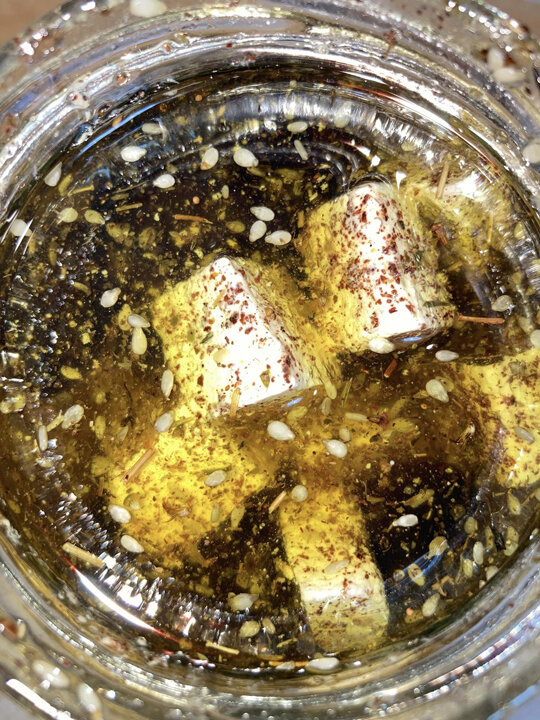 Рассольные сыры без рассола быстро портятся, а из-за солёности их много сразу не съесть. Покупая упаковку такого сыра (брынза, Фета, чанах), я стараюсь сразу весь нарезать кубиками и «законсервировать» в подсолнечном масле. В этот раз купила иранскую брынзу, на мою радость она уже была в виде кубиков, поэтому просто отцедила. Кубики надо обвалять в пряных травах. В этот раз я использовала самодельный заатар (смесь трав). Можно взять смесь прованские травы, итальянские травы и т. п., те, что нравятся. Можно использовать укроп, петрушку, базилик со своего огорода. Можно добавить сушеную паприку кусочками или мелко нарезанные вяленые томаты. Чеснок мелко нарубить и пересыпать им кубики сыра в банке, затем залить маслом и всё. Можно использовать адыгейский сыр, но его стоит подсолить, или использовать в течение нескольких дней. Более солёные сыры в холодильнике запросто простоят месяц, если все кубики сыра будут покрыты маслом. В итоге масло получается ароматным и само по себе является вку