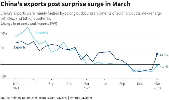 Экспорт в марте вырос на 14,8% по сравнению с прошлым годом, прервав спад пять месяцев подряд и ошеломив экономистов, которые прогнозировали падение на 7,0% в опросе Reuters.