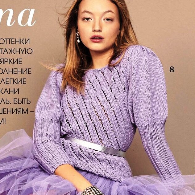 Модно и эффектно смотрится эта кофточка, связанная спицами с диагональным ажуром и пышными рукавами - фонариками. Кофточка не перегружена сложными узорами и в тоже время имеет элегантный силуэт. Размеры: 34/36 (38/40) 42