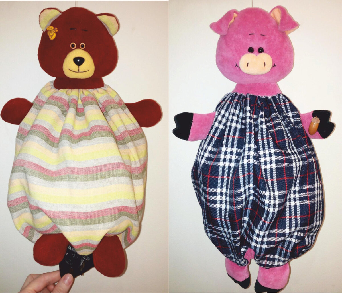 Татьяна Браженкова Пластиковые пакеты вызывают много вопросов со стороны экологов, но они пока есть и часто дома для их хранения нет места. Присмотритесь к этим малышам с толстенькими животиками, в котором найдется место для пакетов. Для шитья такой пакетницы нам понадобятся различные материалы и швейная машинка. Материалы: Фетр, металлическое колечко и леска для крепления. Раскроите детали. Сшейте ушки, выверните, приметайте к голове. Сшейте голову, руки, ноги и "шею". Все выверните. Мордочку сшейте по всей длине, не оставляя отверстия. Потом слегка надрежьте ту сторону, которая будет пришиваться к голове и выверните. Ноги и руки слегка набейте и вышейте на них пальчики. Мордочку набейте, вышейте рот и приклейте нос. Если у вас носик на ножке с шайбой, то сначала установите нос на место, затем набивайте мордочку синтепухом. Приметайте руки к "туловищу-мешку". Затем сшейте мешок по боковым швам. Верх соберите на нитку и стяните до размера окружности "шеи". На кулиске застрочите бо