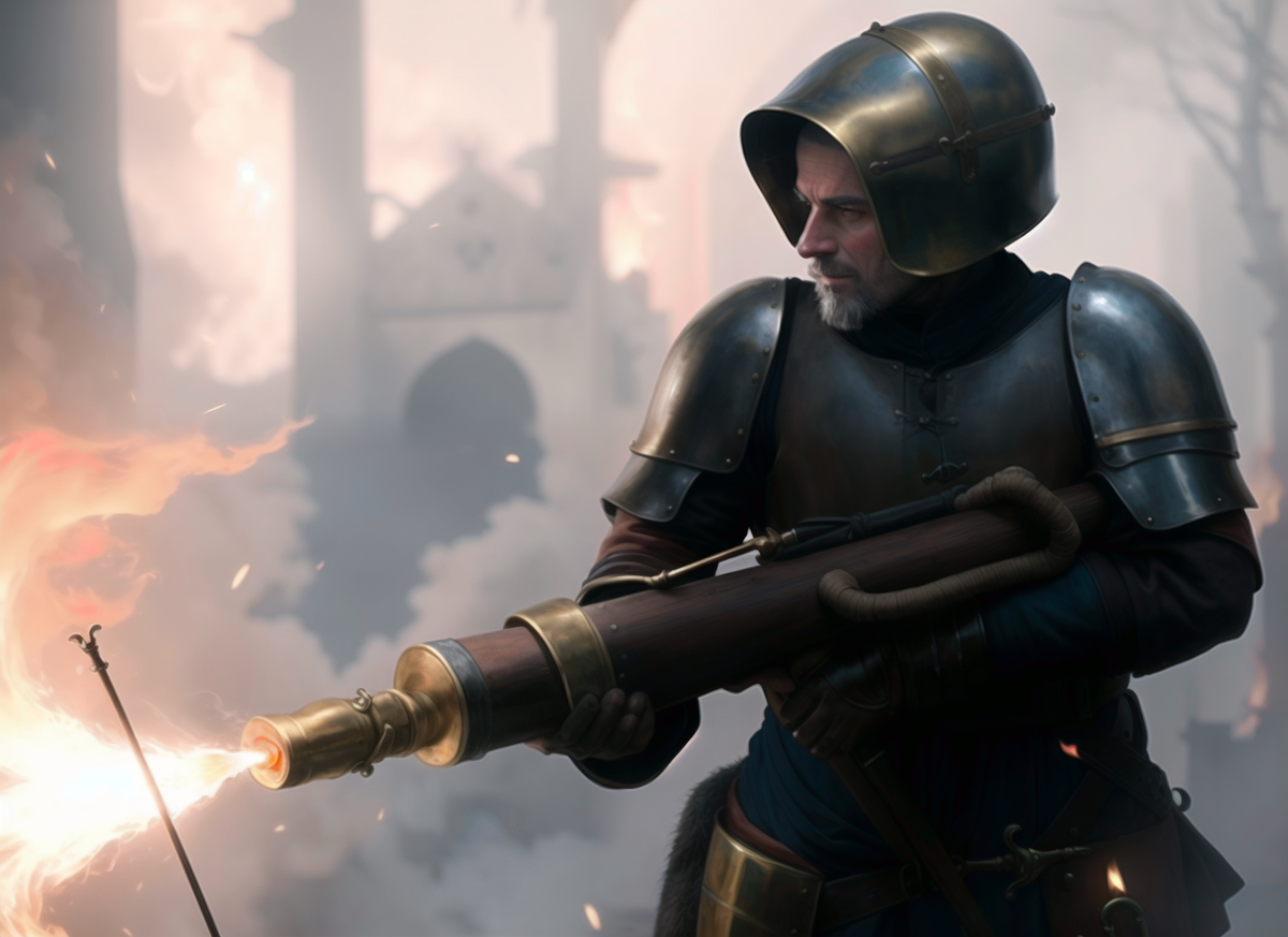 Огнемёт. Изобрести можно в любое время, от древней Греции до Нового времени. Эффективность? Шокирующая. То есть, в шоке и те, кто применяют, и те, по кому применяют. При этом для создания никаких высоких технологий, собственно, не требуется. Если брать средневековье — это может быть вообще простая до примитивности «фугасная» конструкция: труба из бронзы или латуни, внутрь впаяна труба меньшего диаметра так, чтобы она соприкасалась с одной из боковых сторон трубы и была герметична с задней стенкой. Сверху или сзади высверливается отверстие. В меньшую трубу засыпается порох, более-менее герметично закрывается проклеенным пузырем. Заливается до 2/3 большей трубы огнесмесь, открытый конец также закрывается пузырем. Технология проверена, работоспособность доказана. Разве что вместо бронзы была тонкостенная шовная труба, а вместо пузыря — раскрой воздушного шарика. Поднес фитиль, килограмма так два-три-пять весело полыхающей огнесмеси радостно полетело в сторону врага. Метров на двадцать. Ко