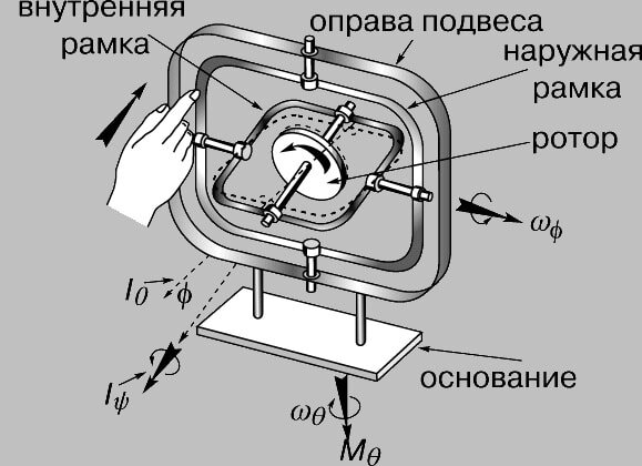 Она остается неподвижной относительно плоскости вращения ротора, если речь о механическом гироскопе. А любое вращающееся тело сопротивляется отклонению от плоскости, в которой оно начало вращаться — можно условно сказать, что гироскоп «стремится» сохранить ее неподвижной. Если понятнее не стало, предлагаем более подробное объяснение. В основе гироскопического эффекта — инерция, то есть свойство любого тела при отсутствии внешних сил сохранять свою скорость и направление движения. Более того, чем массивнее и быстрее объект, тем сильнее он сопротивляется изменению этих параметров. Итоговые скорость и направление движения вычисляются суммой векторов, что важно помнить. Для вращающегося тела ситуация похожая, только есть одна важная модификация. Представим вращающийся диск (ротор гироскопа) не монолитным, а состоящим из привязанных к оси вращения шариков. Каждый из них стремится продолжить свое прямолинейное движение — то есть, улететь дальше по касательной к окружности. Но им не дает прив