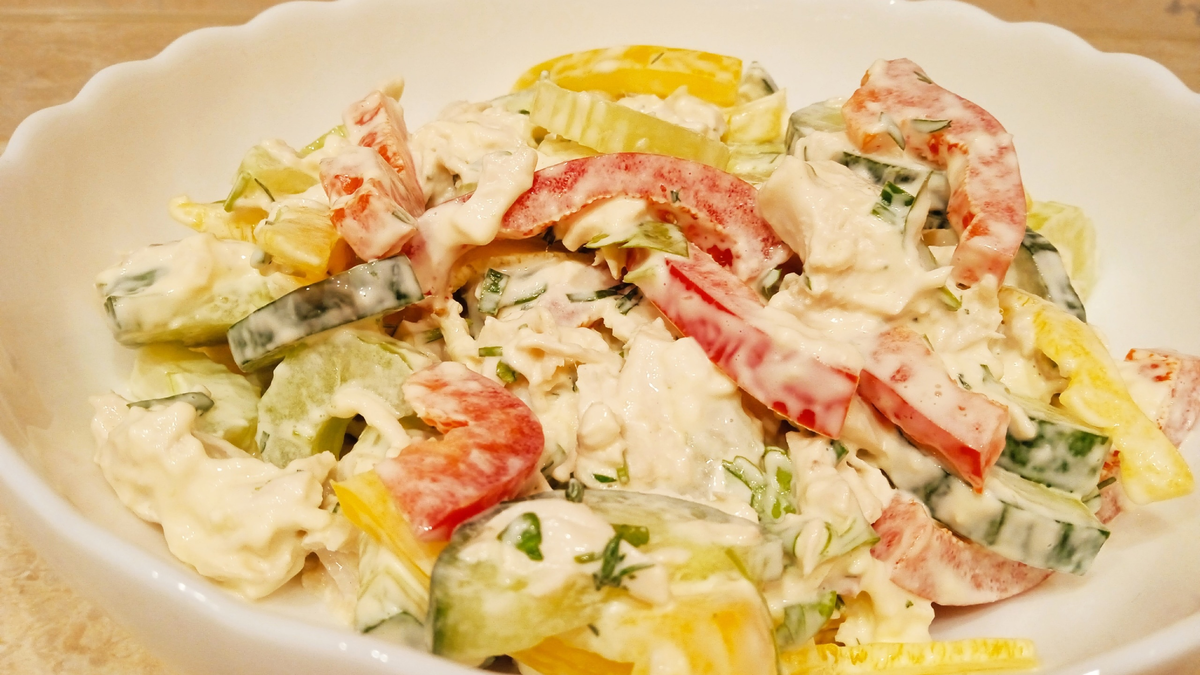 Посоветовала подруга, теперь постоянно готовлю! Салат с курицей, сельдереем, болгарским перцем и огурцом.